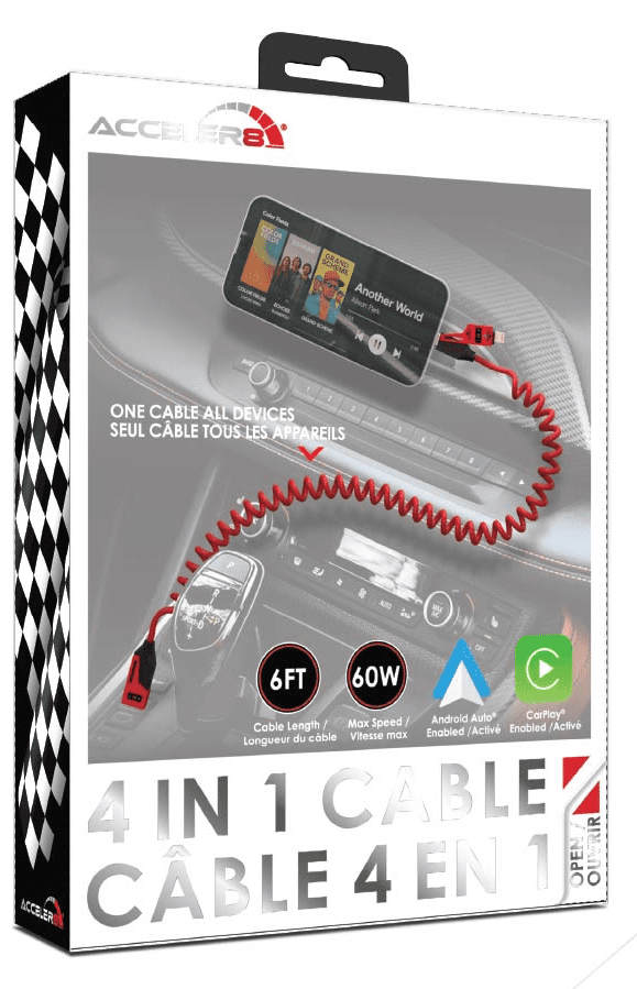 All-in-one charging solution combining USB-A and USB-C inputs with multiple output options for broad device compatibility, including USB-C and iPhone. Features a 6ft coiled design for flexibility and up to 60W fast charging support. A high-utility, space-saving accessory ideal for retail and automotive environments.