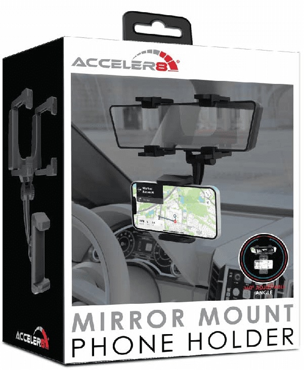 Secure, hands-free phone mount designed to attach directly to rearview mirrors for optimal visibility and safety. Features an adjustable cradle and 360° rotation for flexible positioning across a wide range of devices. Ideal for retail and automotive channels, offering a clean install with no windshield obstruction.
