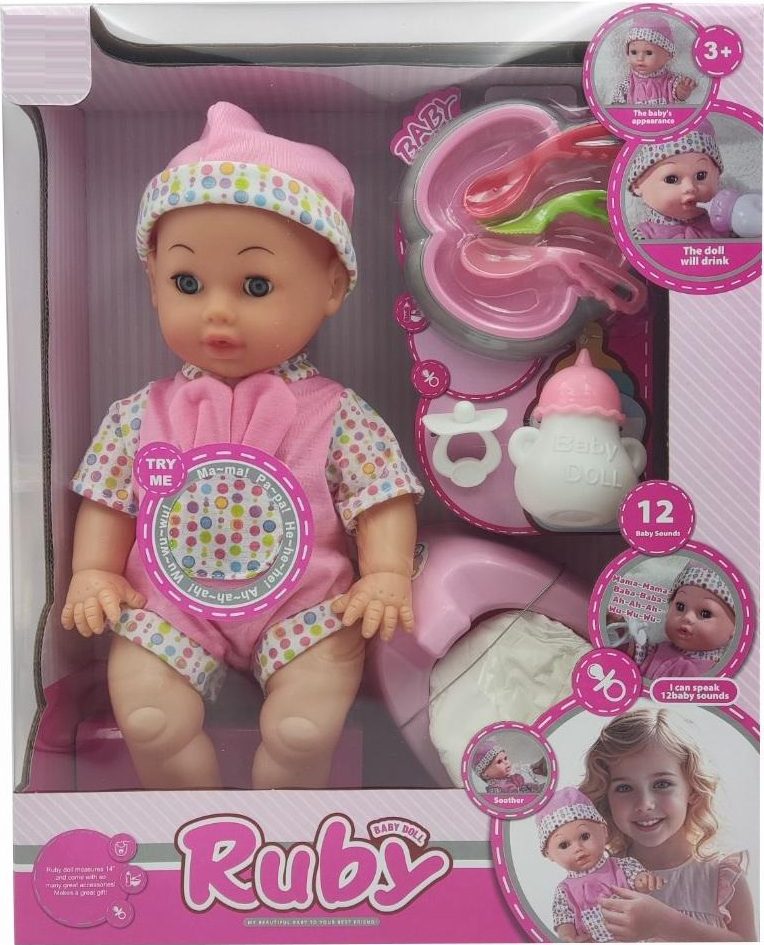 Ruby includes interactive features such as drinking from her bottle and producing multiple baby sounds, making play more realistic and engaging. The set also comes with essential accessories including a bottle, pacifier, and feeding set to enhance the experience.