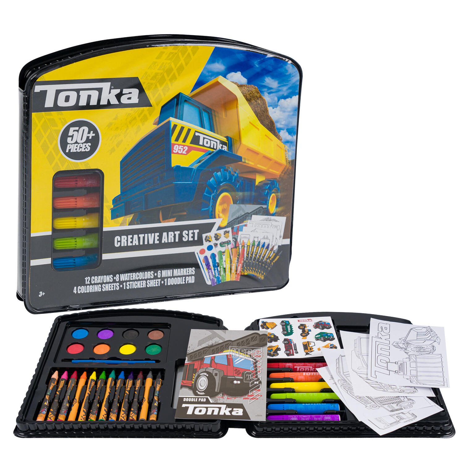 50-Piece Tonka Art Set – This set includes 12 crayons, 8 watercolors, 6 mini markers, 4 coloring sheets, 1 sticker sheet, and 1 doodle pad. Age 3+.